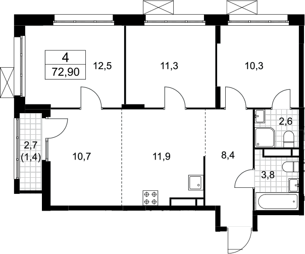 4-комнатная квартира № 202, 71.50 м2 без отделки 10 эт.