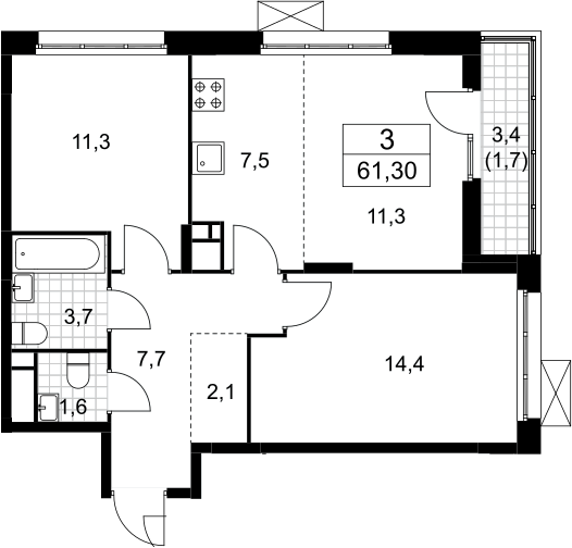 3-комнатная квартира № 243, 59.60 м2 без отделки 15 эт.
