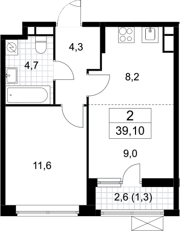 2-комнатная квартира № 626, 37.80 м2 без отделки 8 эт.