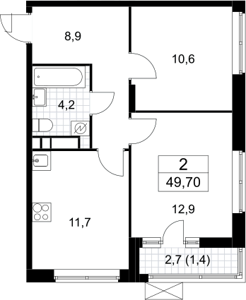 2-комнатная квартира № 722, 48.30 м2 без отделки 12 эт.