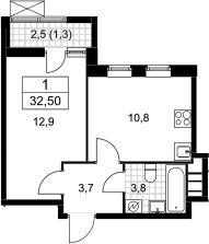 1-комнатная квартира № 1096, 31.20 м2 с отделкой 16 эт.