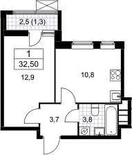 1-комнатная квартира № 913, 31.20 м2 без отделки 16 эт.