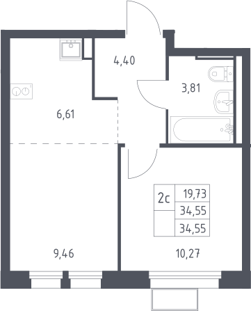 2-комнатная квартира № 813, 34.55 м2 с отделкой 10 эт.