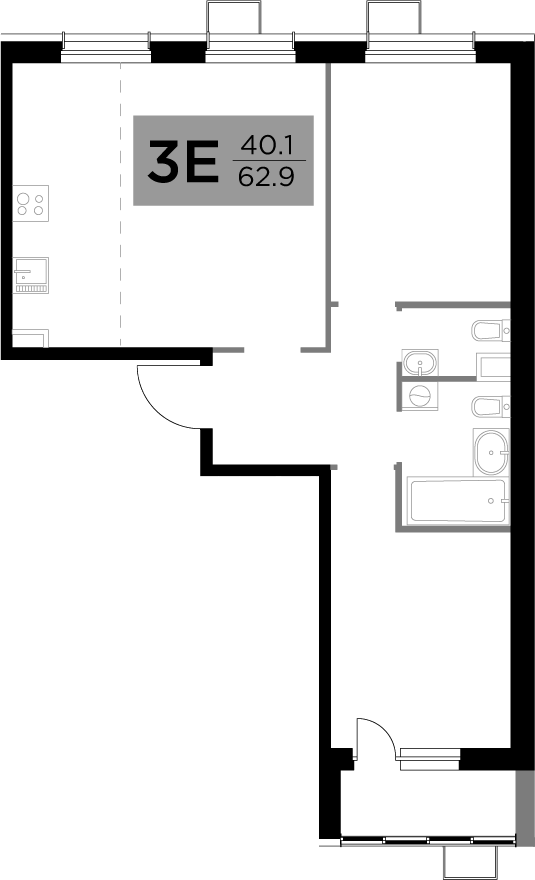 3-комнатная квартира № 95, 61.25 м2 без отделки 10 эт.