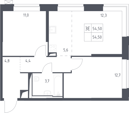 3-комнатная квартира № 98, 54.50 м2 с отделкой 8 эт.