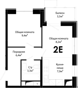 2-комнатная квартира № 2-4.15.10, 34.40 м2 без отделки 15 эт.
