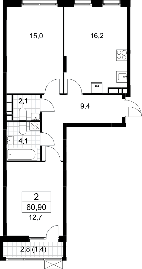 2-комнатная квартира № 230, 59.50 м2 с отделкой 6 эт.