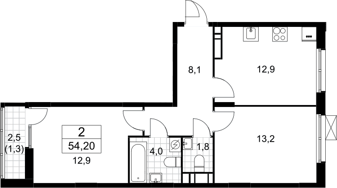 2-комнатная квартира № 729, 52.90 м2 без отделки 9 эт.