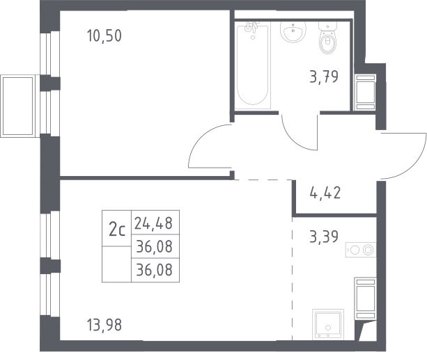 2-комнатная квартира № 50, 36.08 м2 с отделкой 6 эт.