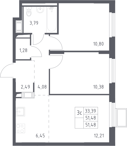 3-комнатная квартира № 398, 51.48 м2 с отделкой 13 эт.
