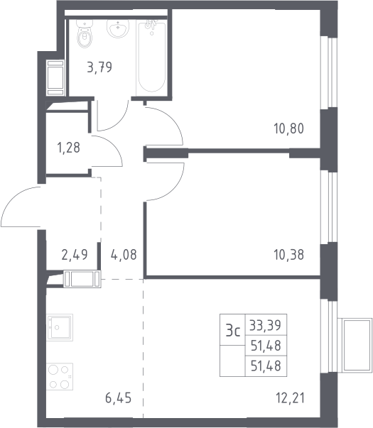 3-комнатная квартира № 434, 51.48 м2 с отделкой 17 эт.