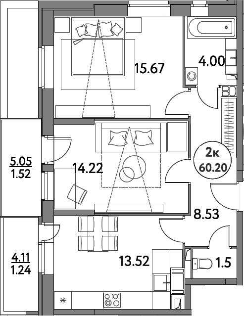 2-комнатная квартира № 132, 57.44 м2 без отделки 12 эт.