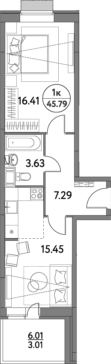 2-комнатная квартира № 247, 42.78 м2 без отделки 17 эт.