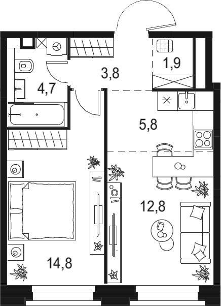 2-комнатная квартира № 74, 43.80 м2 без отделки 9 эт.