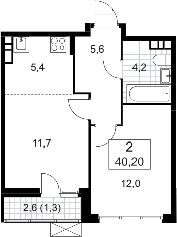 2-комнатная квартира № 64, 38.90 м2 без отделки 6 эт.