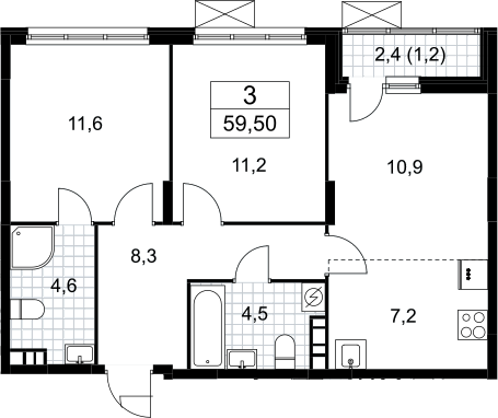 3-комнатная квартира № 195, 58.30 м2 без отделки 3 эт.