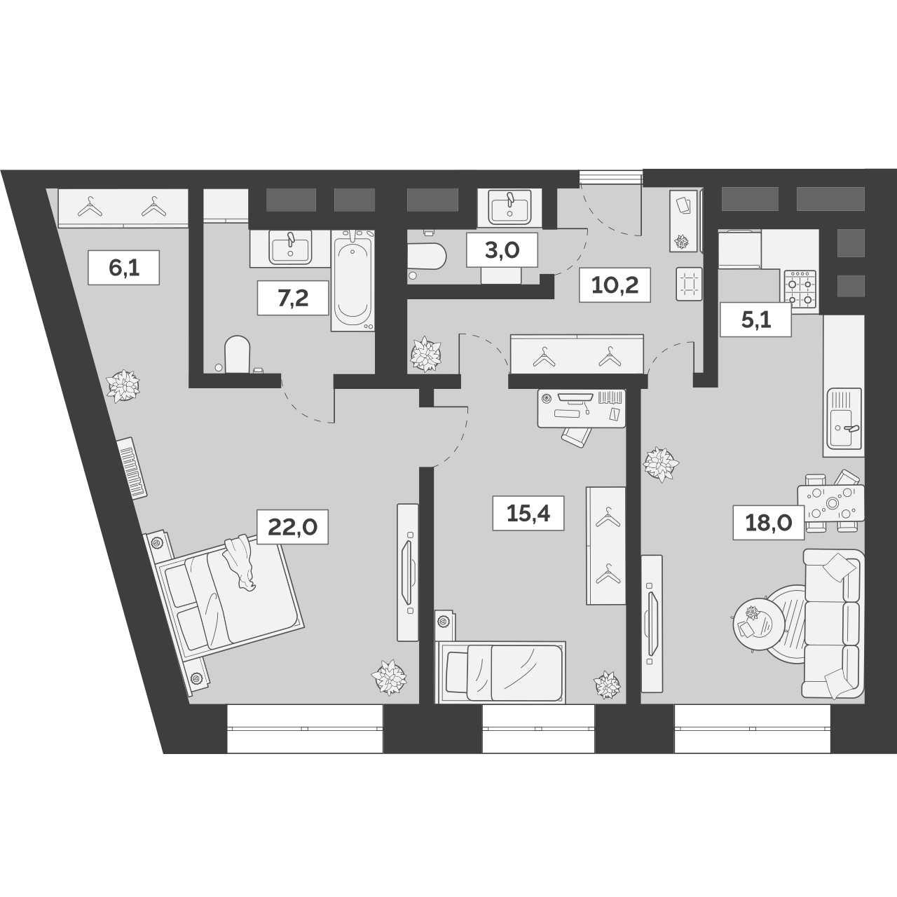 3-комнатная квартира № 386, 87.00 м2 без отделки 24 эт.