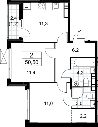 2-комнатная квартира № 321, 49.30 м2 без отделки 8 эт.
