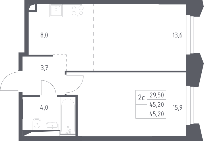 2-комнатная квартира № 163, 45.20 м2 с отделкой 2 эт.