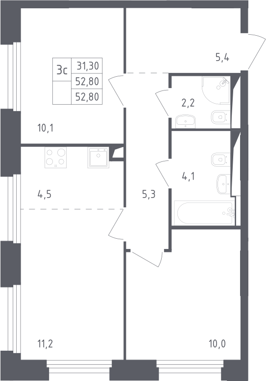 3-комнатная квартира № 482, 52.80 м2 с отделкой 2 эт.