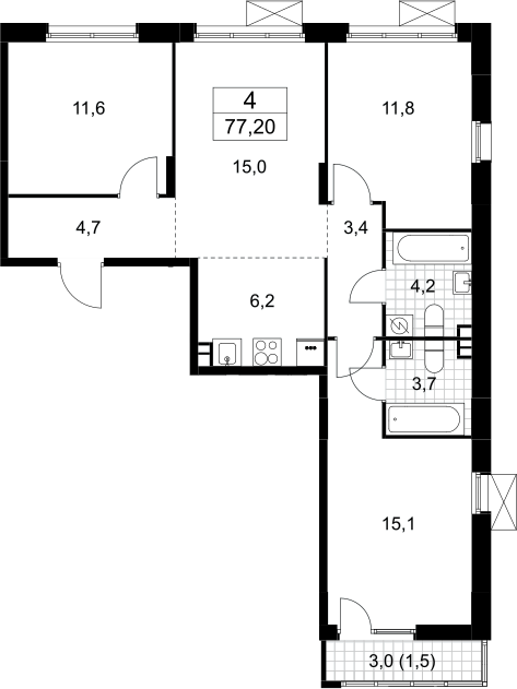 4-комнатная квартира № 7, 75.70 м2 с отделкой 3 эт.