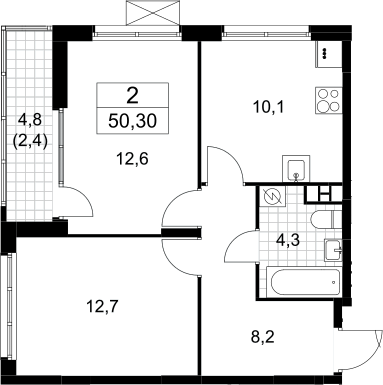 2-комнатная квартира № 419, 47.90 м2 без отделки 6 эт.