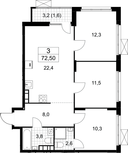 4-комнатная квартира № 185, 70.90 м2 с отделкой 17 эт.