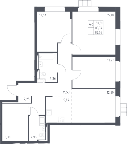 4-комнатная квартира № 154, 85.74 м2 с отделкой 15 эт.