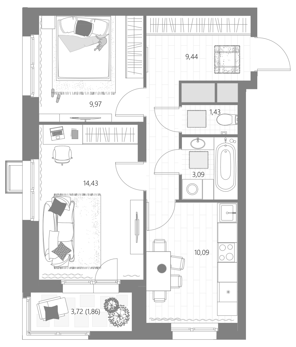 2-комнатная квартира № 293, 48.45 м2 с отделкой 4 эт.