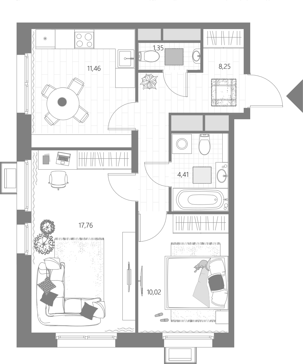 2-комнатная квартира № 200, 53.25 м2 с отделкой 22 эт.