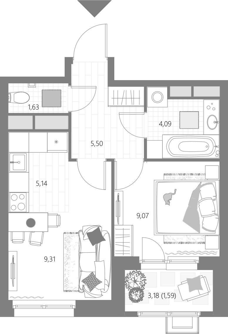 2-комнатная квартира № 635, 34.74 м2 без отделки 12 эт.