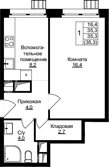1-комнатная квартира № 101, 35.30 м2 без отделки 9 эт.