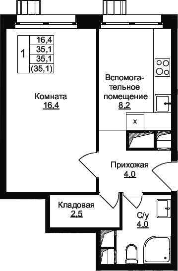 1-комнатная квартира № 116, 35.10 м2 без отделки 10 эт.