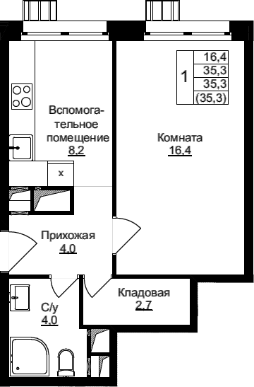 1-комнатная квартира № 199, 35.30 м2 без отделки 16 эт.