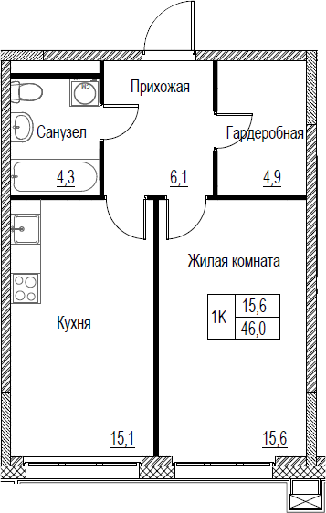 1-комнатная квартира № 3, 46.00 м2 без отделки 2 эт.