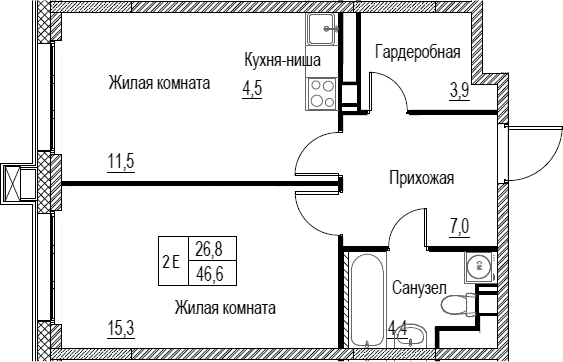 2-комнатная квартира № 136, 46.60 м2 без отделки 3 эт.