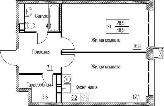2-комнатная квартира № 218, 48.90 м2 без отделки 3 эт.