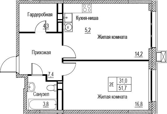 2-комнатная квартира № 219, 51.70 м2 без отделки 3 эт.