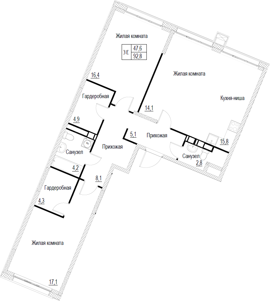 3-комнатная квартира № 599, 92.80 м2 без отделки 6 эт.