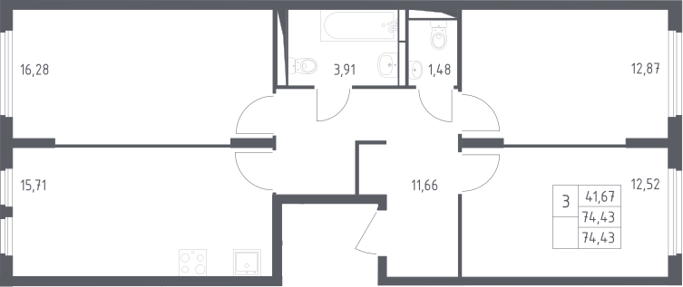 3-комнатная квартира № 72, 74.43 м2 с отделкой 13 эт.