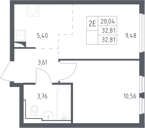 2-комнатная квартира № 461, 32.81 м2 с отделкой 8 эт.