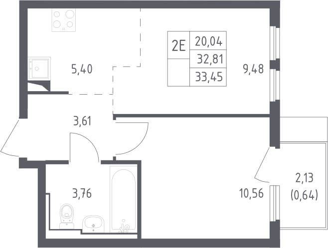 2-комнатная квартира № 491, 32.81 м2 с отделкой 14 эт.