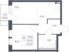 2-комнатная квартира № 101, 34.63 м2 с отделкой 9 эт.