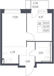 2-комнатная квартира № 205, 32.39 м2 с отделкой 9 эт.