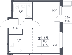2-комнатная квартира № 309, 34.63 м2 с отделкой 9 эт.