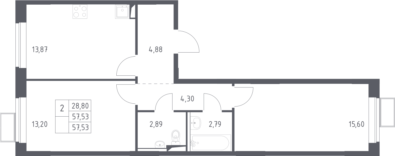 2-комнатная квартира № 51, 57.53 м2 с отделкой 2 эт.
