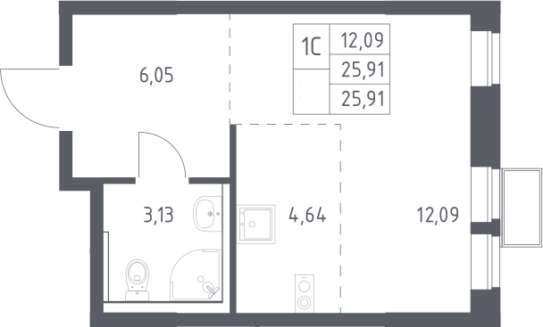 Студия № 523, 25.91 м2 с отделкой 9 эт.