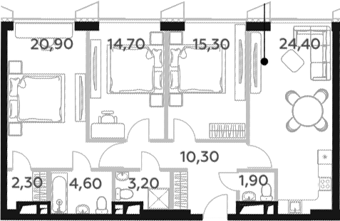 4-комнатная квартира № 1632, 97.60 м2 без отделки 28 эт.