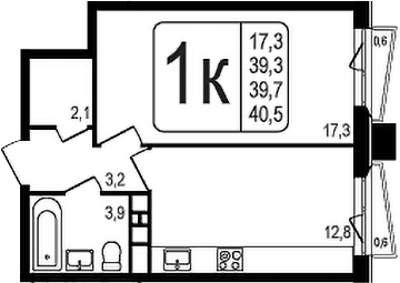 1-комнатная квартира № 215, 39.30 м2 без отделки 6 эт.