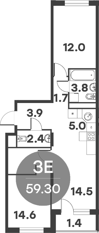 3-комнатная квартира № 307, 57.90 м2 без отделки 5 эт.
